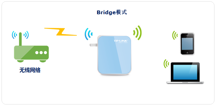 Bridge(桥接)模式利用设备的桥接功能,与前端无线网络建立无线连接,自身发出新的无线信号,形成新的无线覆盖范围,可以有效的解决信号弱及信号盲点等无线覆盖问题。