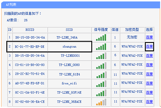 在扫描页面中找到主路由器的SSID,点击 连接,如下图: