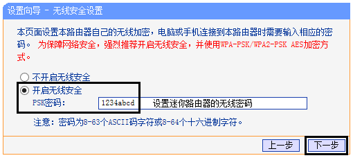 在 PSK密码 中设置迷你路由器的无线密码,点击 下一步,如下图: