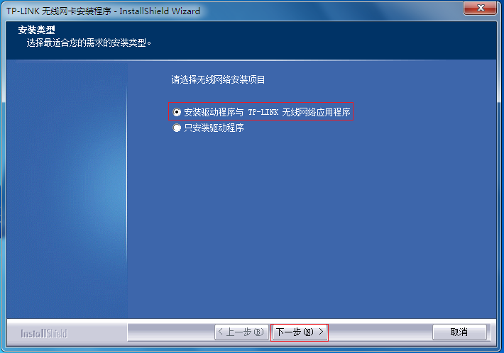 双击 setup.exe 运行软件,选择 安装驱动程序与TP-LINK无线网络应用程序,点击 下一步,如下图: