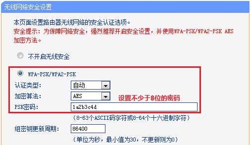 设置无线密码:点击“ 无线设置 > 无线安全设置”, 选择“WPA-PSK/WPA2-PSK”,填写不少于8位的“PSK密码”。