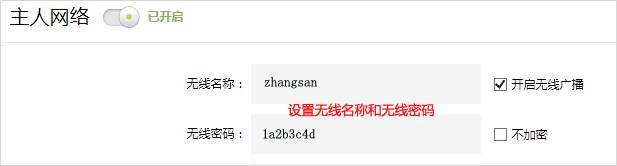 进入管理界面后,点击“高级设置 > 无线设置>主人网络” ,分别在“无线名称”,“无线密码”设置。提醒无线名称不建议设置中文或特殊字符,无线密码填写不少于八位。