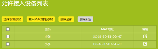 如果某允许接入的设备当前没有连接无线信号,则需要手动添加,即点击输入MAC地址添加。
