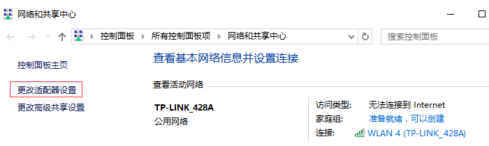 2、弹出 网络和共享中心 的界面,点击 更改适配器设置。如下图所示: