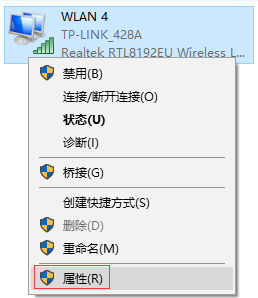 3、打开 更改适配器设置 后,找到 WLAN,右键点击并选择 属性。如下图所示: