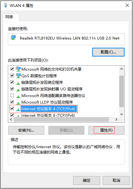 4、找到 Internet协议版本4(TCP/IPv4),点击 属性。如下图所示: