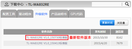 在我司官网下载中心,请根据无线扩展器的具体型号,下载并升级最新升级软件,如下图: