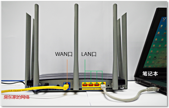 将房东家接过来的网线连接到路由器的WAN口,电脑连接到1/2/3/4任意一个LAN口,如下图: