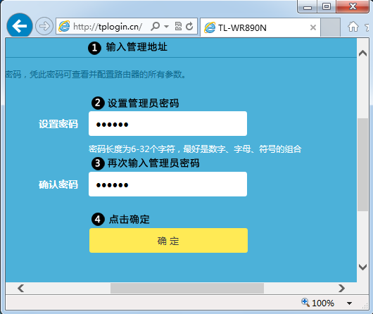 打开浏览器,清空地址栏并输入路由器的管理地址tplogin.cn(部分为192.168.1.1),在弹出的设置管理密码界面中,设置6~15位的管理密码,点击 确定,登录路由器管理界面。