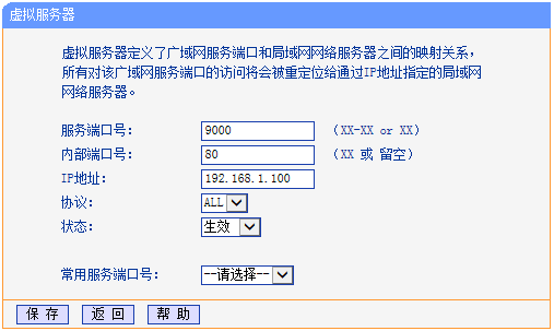 例如,局域网WEB服务器IP地址为192.168.1.100、端口80,路由器WAN口地址为121.202.33.100,路由器上设置的虚拟服务器映射规则如下: