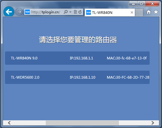 终端设备连接主或副路由器,在浏览器的地址栏中输入tplogin.cn,在浏览器中会显示局域网中的所有云路由器型号,选择需要登录的路由器即可,和WDS无线桥接时登录方法一致。