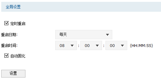 在无线控制器的管理界面,点击“AP管理>AP设置”,在“全局设置”的下面,勾选“定时重启”,选择AP自动重启的日期时间,如下图: