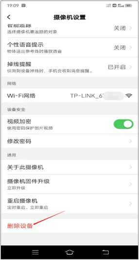 在手机APP上登录无线IPC/NVR之前绑定的TP-LINK ID,进入需要删除的摄像头设置界面,在设置界面的最底部点击“删除设备”选项,在弹框提示中点击“删除”,即可注销目前登录的TP-LINK ID。如下图: