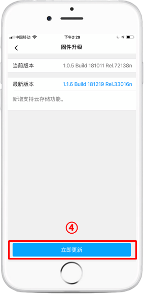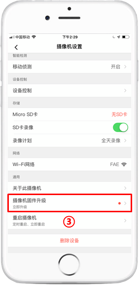 进入“固件升级”进入到摄像头设置界面,在“摄像机固件升级”处有一小红点,点击进入将会提醒最新固件,再点击“立即更新”进行设备固件升级。: