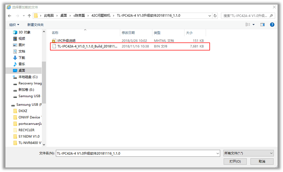 点击“浏览”按钮,找到IPC解压后的升级软件,选中bin文件并点击 打开,如下: