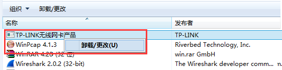 建议在电脑的“控制面板”>“程序和功能”中,找到 TP-LINK无线网卡产品的应用程序,右键点击“卸载”,如下:
