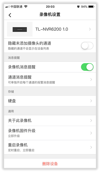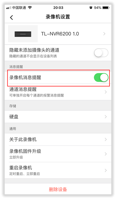 打开TP-LINK安防APP,进入录像机设置页面,开启【录像机消息提醒】: