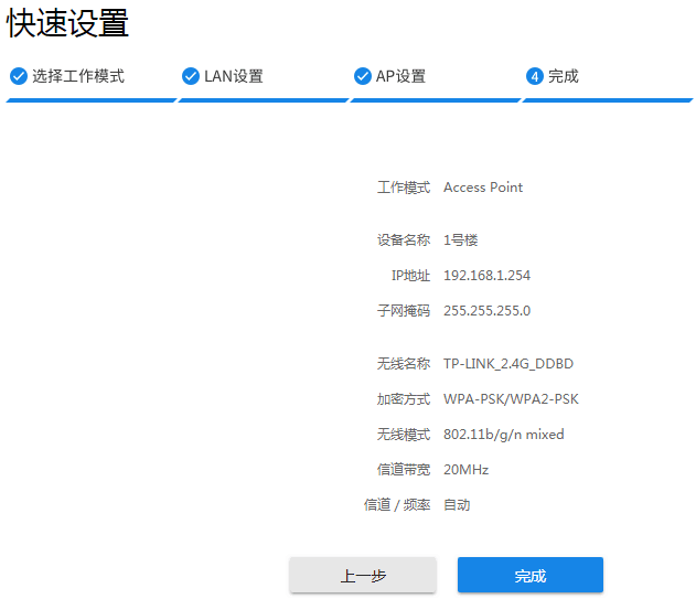 确认设置的网络参数,如下图。设置无误的话,点击“完成”。AP端设置完毕。
