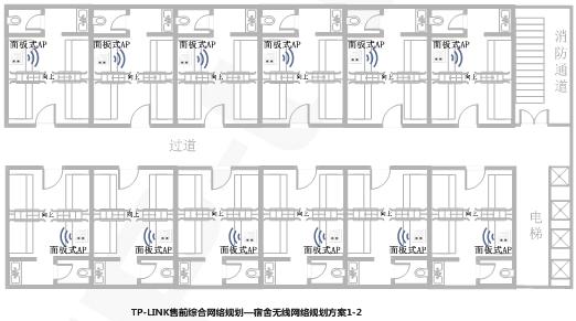 高性价比方案通过在公寓、宿舍走廊过道位置天花板安装吸顶式AP,实现公寓、宿舍内部全覆盖,方案性价比优越,房间内部90%以上区域覆盖效果良好,适用于一般公寓、宿舍环境。
