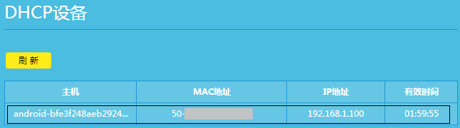 确认方法:先将路由器断电重启,然后再使用无线终端连接路由器的无线信号。等待无线终端连接成功后,使用电脑登录路由器管理界面,点击 路由设置 >> DHCP服务器,查看 DHCP设备 列表,如有无线终端的条目,说明无线终端的IP地址、DNS服务器地址是自动获取,如下图: