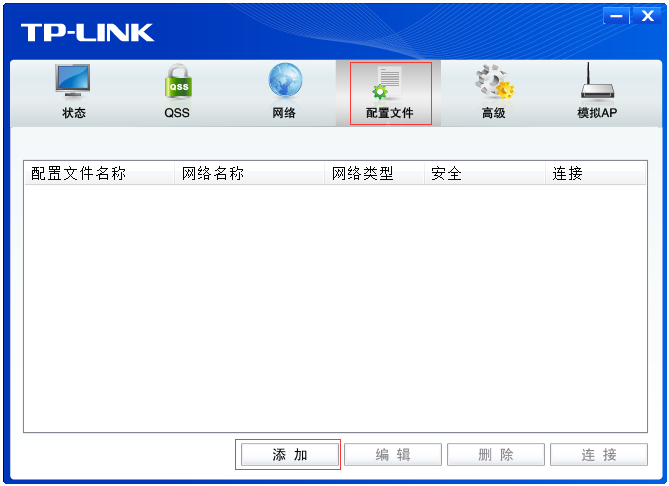 网卡驱动及客户端程序安装完成后,打开客户端应用程序,点击 配置文件 >> 添加,如下图所示: