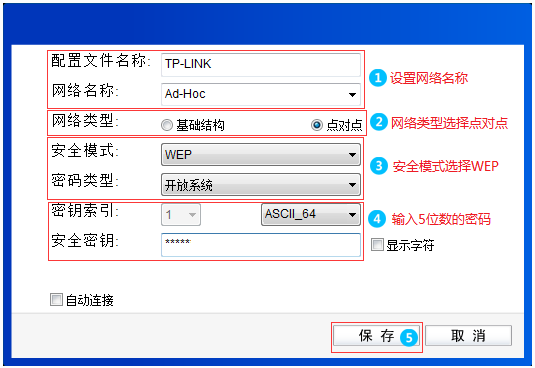 在弹出的对话框中,自定义设置配置文件名,设置 网络名称,网络类型选择 点对点,安全模式选择WEP(Ad-Hoc网络仅支持WEP加密),在安全密钥中输入密码,如下图所示: