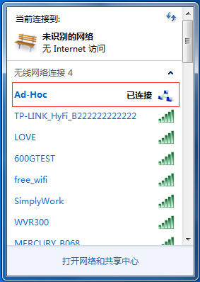 Ad-Hoc网络设置完成后,无线终端连接上Ad-Hoc的网络即可实现互访,以Windows 7系统的电脑为例,连接无线信号的方法如下: